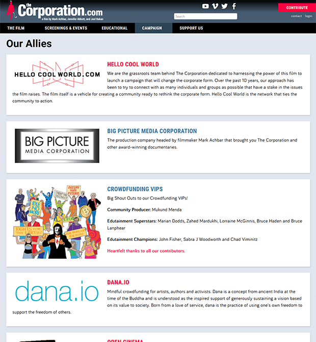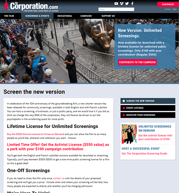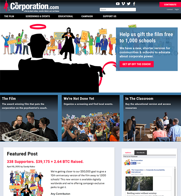 We helped The Corporation film celebrate its 10th anniversary by building a new website in Drupal using the Amani distribution developed by Peace Geeks. We made major changes to the appearance and created additional page templates to give the groundbreaking documentary renewed vigour as it campaigns to get the film free into 1,000 schools.