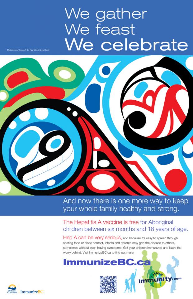 We created this First Nations focused campaign for Immunize BC with the goal of ensuring that the message was positive and celebratory rather then fear-based. We collaborated with the First Nations Health Council, who put us in touch with Andrew Dexel who licenced his wonderful artwork to the campaign. We also did a radio ad with Dr. Evan Adams doing a voice over and the music of Cheryl L'hirondelle.
