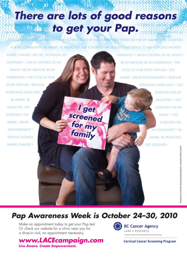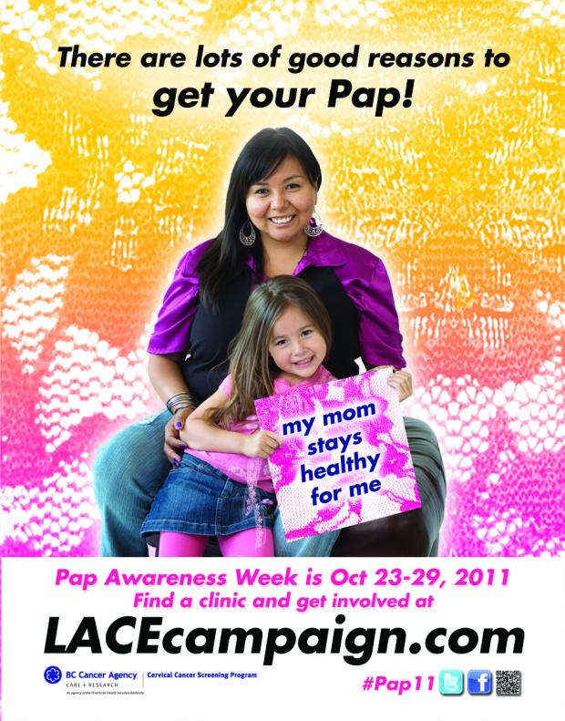 In 2010, Lee Anne Deneault won our LACE Campaign ad contest with a concept from her community based on cards with reasons to get your Pap. We travelled to Q'wemptsín Health Society in Kamloops where we did a photoshoot and a video. The materials we created were used to promote Pap Awareness Week all over BC that year. We made a short video, postcards, posters and even had a full page ad in Chatelaine Magazine. Even though the LACE campaign was meant for all women in BC, we were very pleased to have had a high percentage of First Nations communities sign on.