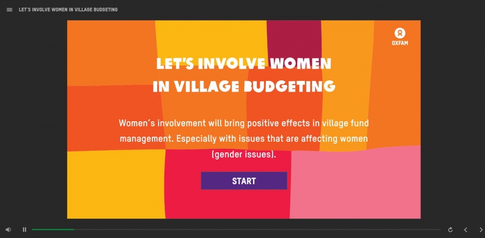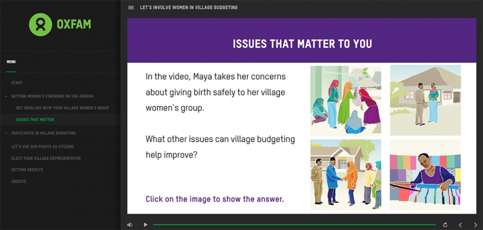 We developed an e-learning course for Oxfam Canada that was part of a larger “Power Up” women’s empowerment project in Indonesia, which encourages women’s participation in the budgeting process. This interactive module inspires women to get the issues they care about on the village agenda and funded, while providing tips on how to navigate the process and overcome barriers.