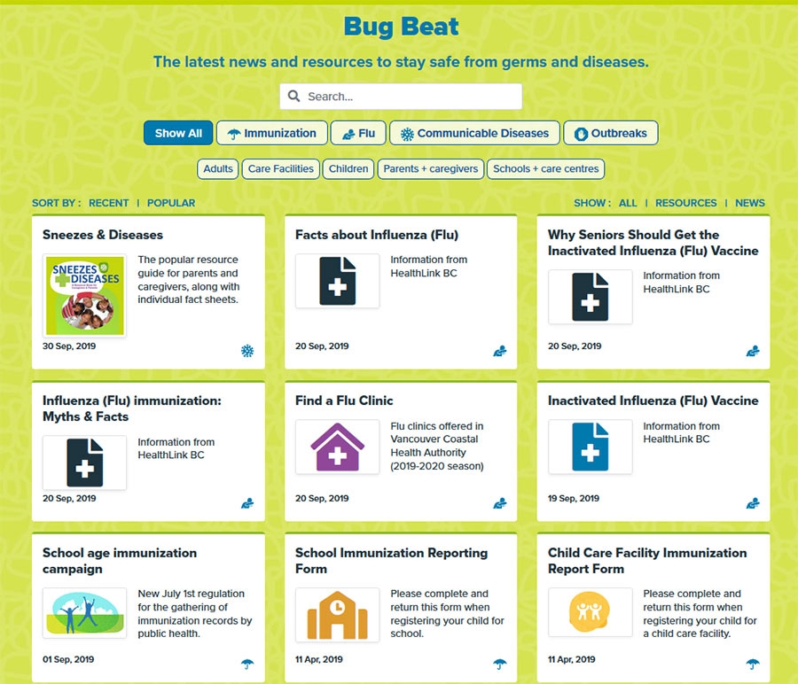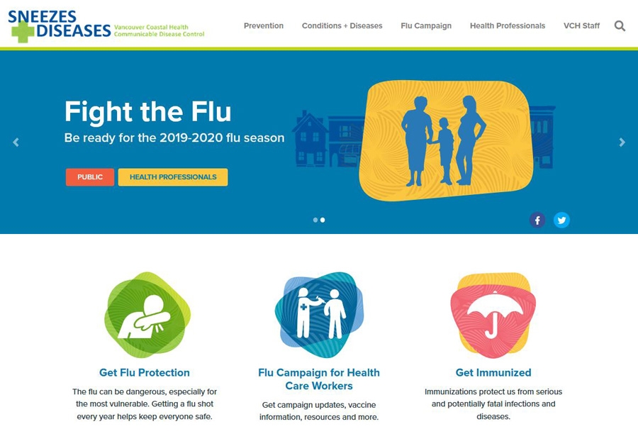 After creating a series of graphics for Vancouver Coastal Health's Communicable Disease Control Program to use in their outreach materials, we developed a new website under the brand identity, “Sneezes+Diseases.” Their first website, VCH CDC needed a user-friendly solution to manage their program's content and resources that would operate in tandem with a myriad of VCH web properties. The site includes password protected areas, integrated news and resource feeds targeted to multiple audiences, and an online manual for disease control training.