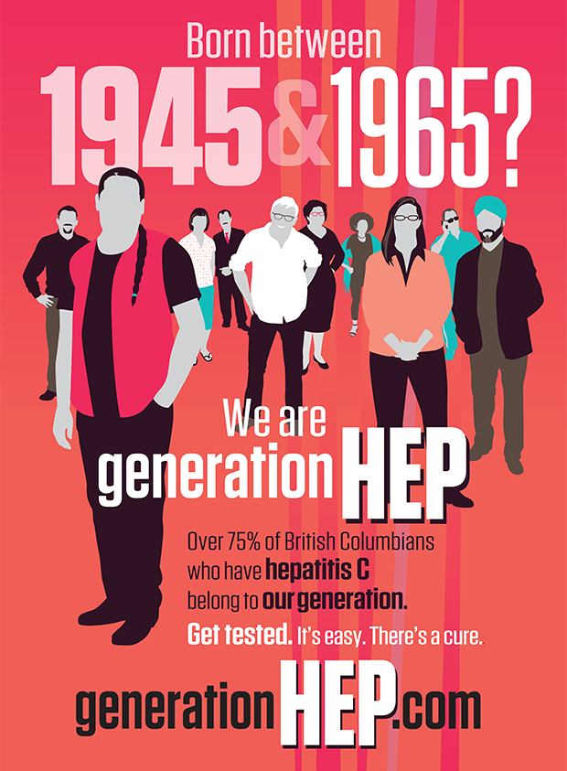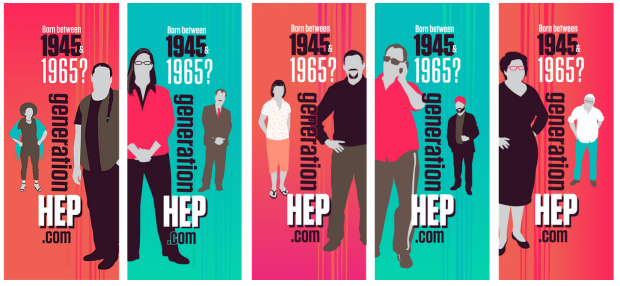 We created a branded campaign about hepatitis C targeted at Baby Boomers (born 1945-1965), coming up with an entire new demographic: Generation Hep. The rollout of the campaign is tied into World Hepatitis Day 2015, officially launching on July 28. We produced sky train ads, display banners, postcards, posters and a campaign website. Together with partners we formed a planning committee to steer the brand forward. Our vision is a national brand that has the resources to do a significant branding campaign while being grassroots driven. All so that our message that everyone in "Generation Hep" should get tested. It's easy and there's a cure.