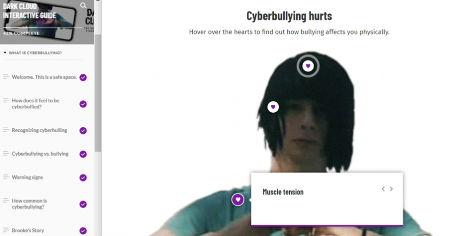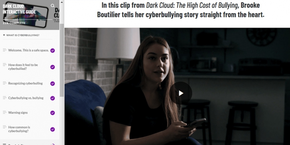 Dark Cloud: The High Cost of Cyberbullying explores the devastating impacts of cyberbullying on the lives of young people. We developed educational resources and a digital campaign for the film to help parents, educators and youth understand the impacts of cyberbullying and how to respond. This included creating an online, interactive guide featuring impactful video clips, quizzes and more that is fully responsive and accessible.