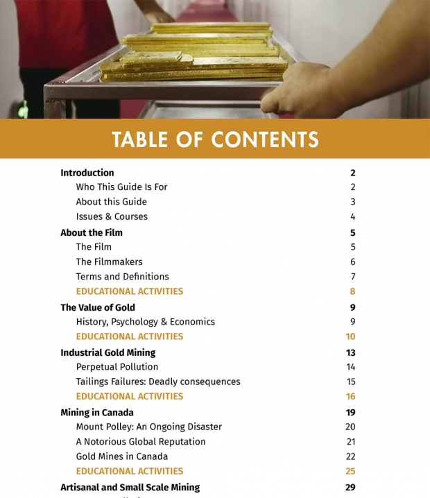For the 2019 film, The Shadow of Gold, we developed a 36-page Educator’s Guide to help high educators inspire critical and solution-focused conversations about the social, economic and environmental impacts of gold mining and resource extraction. The guide includes classroom activities and linked film clips to provoke discussion and action.